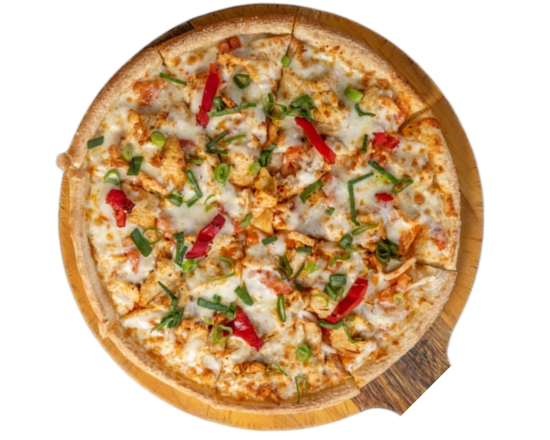 A rich buttery sauce base layered with roasted chicken, fresh spinach, tomato, onion, roasted peppers, mozzarella, and finished with chilli flakes0