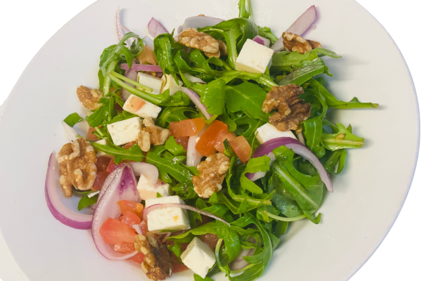 $12.95Baby Rocket leaves, tomato, spanish onion, capsicum, feta, olive oil and balsamic dressing, topped with walnutsOut of stockDesserts